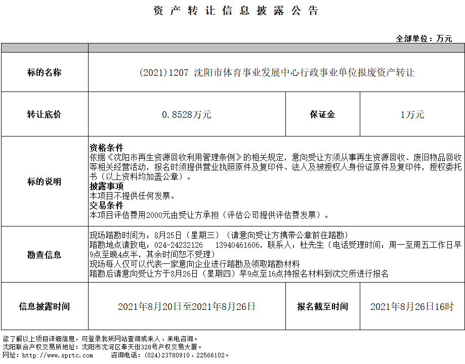 沈陽市體育事業(yè)發(fā)展中心行政事業(yè)單位報廢資產(chǎn)轉(zhuǎn)讓