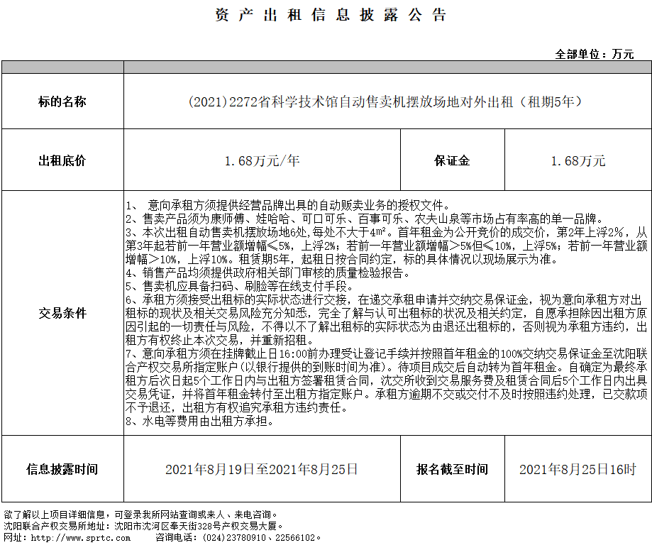 遼寧省科學(xué)技術(shù)館自動售賣機擺放場地對外出租(租期5年)