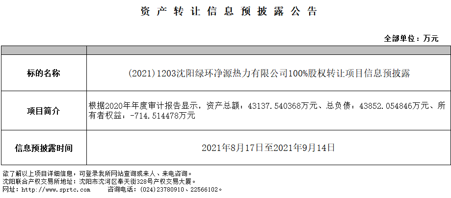 沈陽綠環(huán)凈源熱力有限公司100%股權(quán)轉(zhuǎn)讓