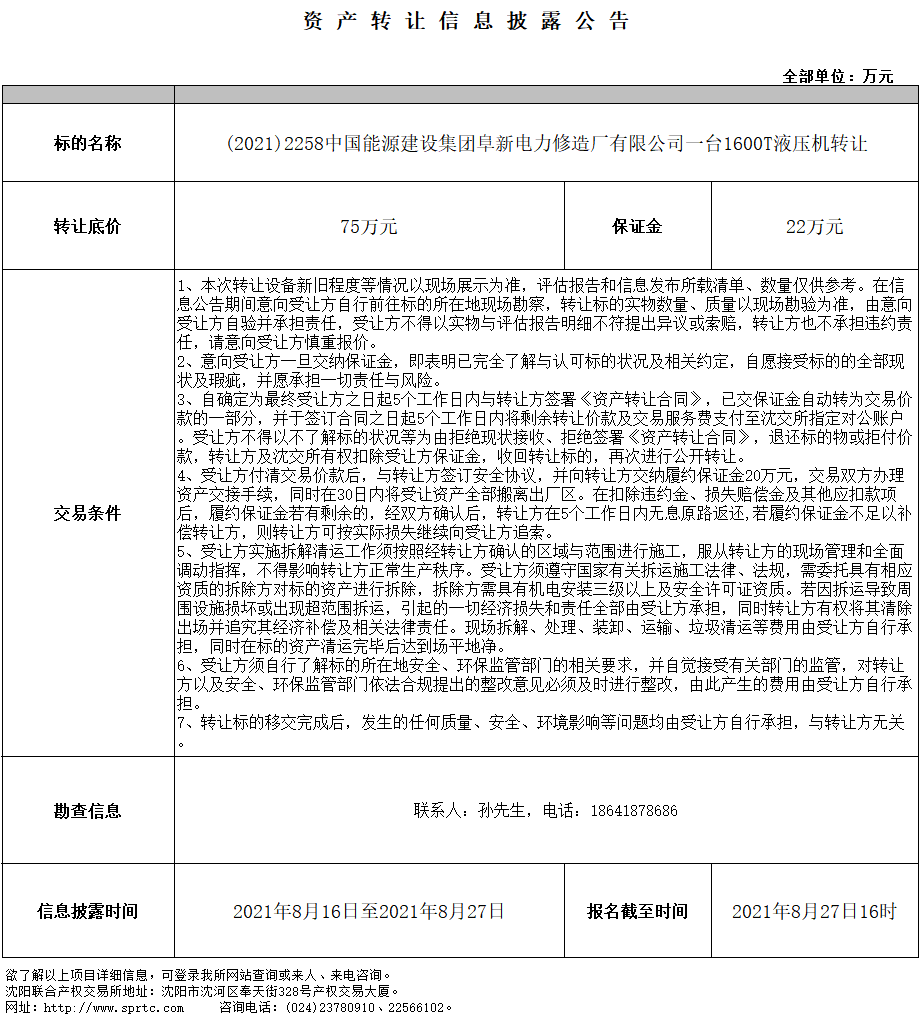 中國(guó)能源建設(shè)集團(tuán)阜新電力修造廠有限公司一臺(tái)1600T液壓機(jī)轉(zhuǎn)讓