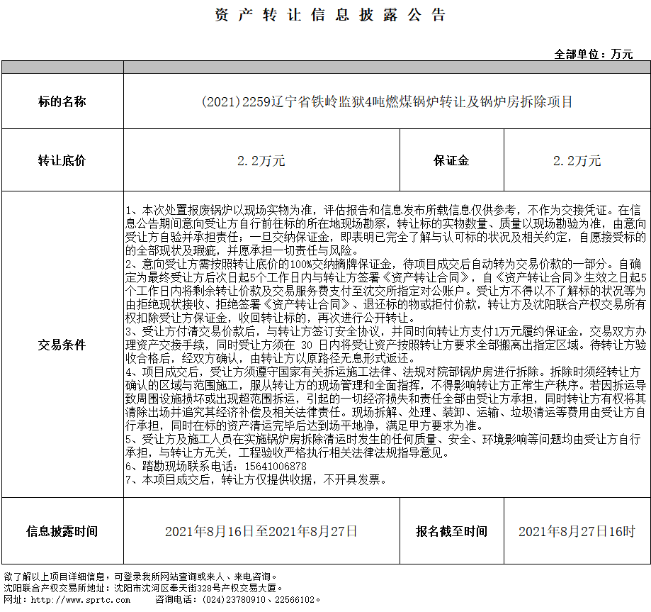遼寧省鐵嶺監(jiān)獄4噸燃煤鍋爐轉(zhuǎn)讓及鍋爐房拆除