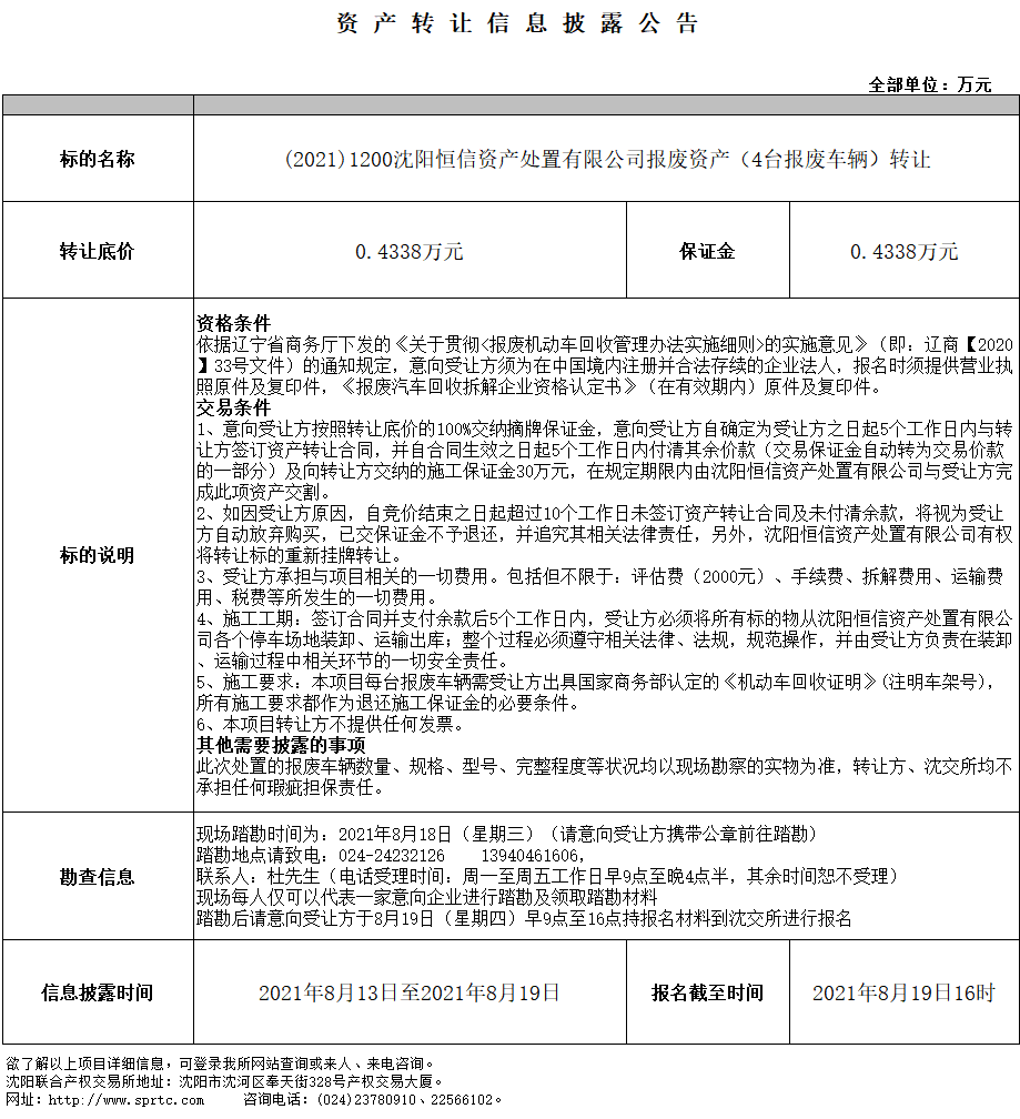沈陽恒信資產(chǎn)處置有限公司報(bào)廢資產(chǎn)轉(zhuǎn)讓(4臺報(bào)廢車輛)