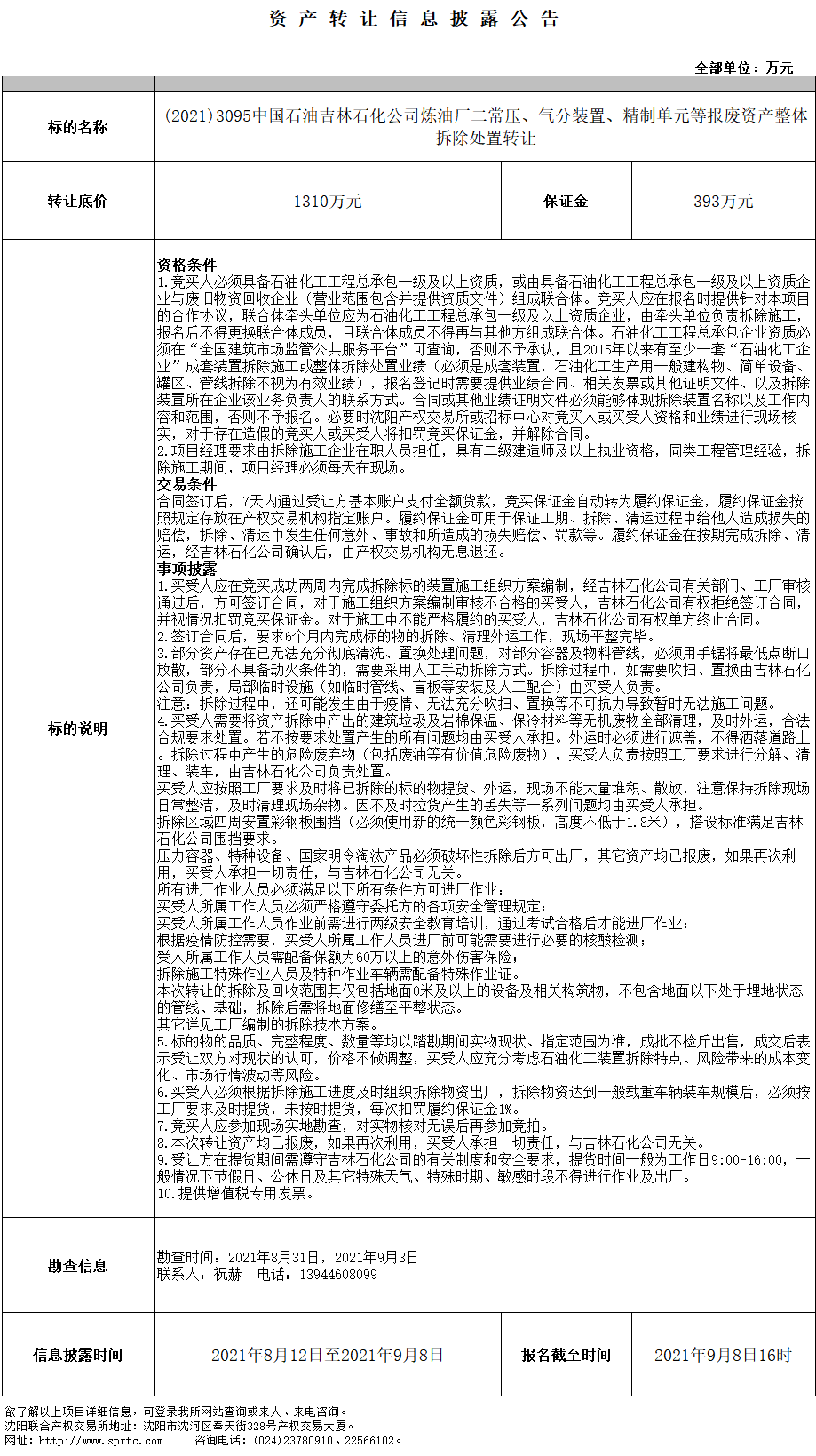 中國石油吉林石化公司煉油廠二常壓、氣分裝置、精制單元等報廢資產整體拆除處置項目