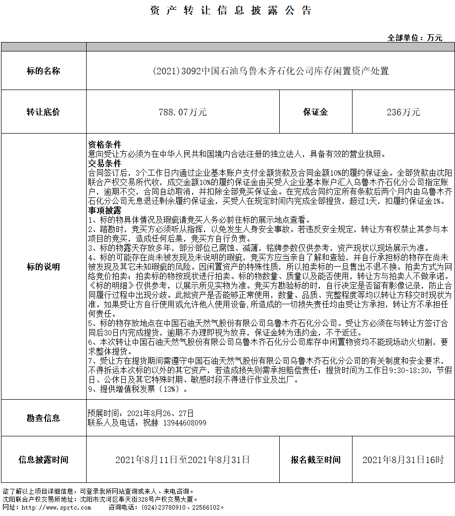 中國(guó)石油烏魯木齊石化公司庫(kù)存閑置資產(chǎn)轉(zhuǎn)讓