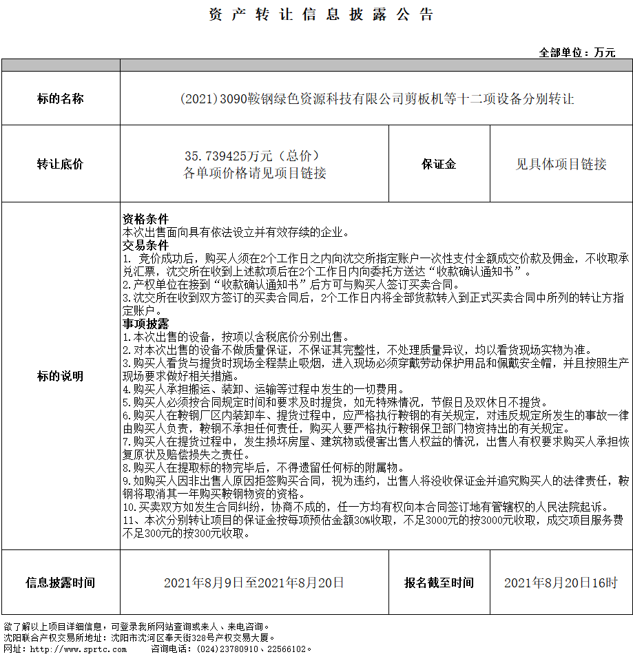 (2021)3090鞍鋼綠色資源科技有限公司剪板機等十二項設(shè)備分別轉(zhuǎn)讓