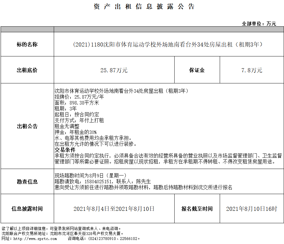 沈陽市體育運(yùn)動學(xué)校外場地南看臺外34處房屋出租(租期3年)