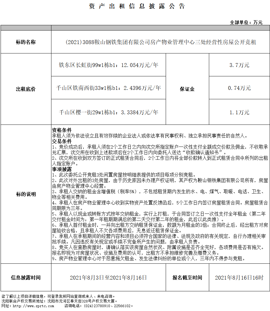 (2021)3088鞍山鋼鐵集團有限公司房產(chǎn)物業(yè)管理中心三處經(jīng)營性房屋公開競租