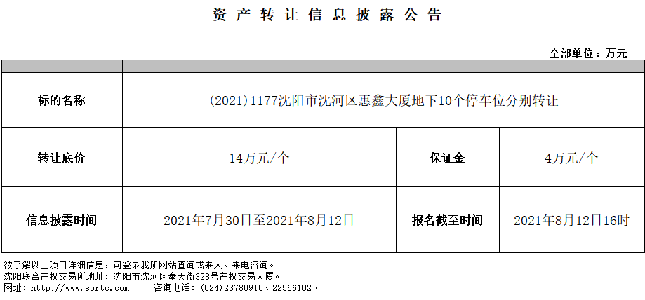 (2021)1177沈陽(yáng)市沈河區(qū)惠鑫大廈地下10個(gè)停車(chē)位分別轉(zhuǎn)讓