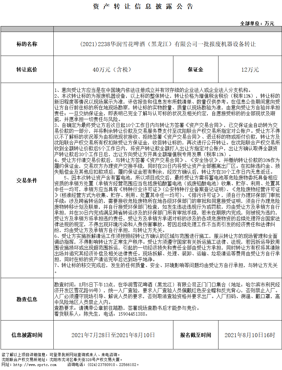 華潤雪花啤酒(黑龍江)有限公司 一批報(bào)廢機(jī)器設(shè)備轉(zhuǎn)讓