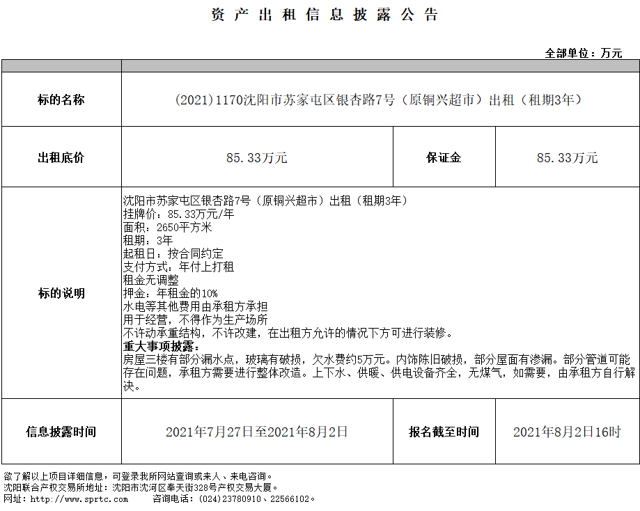 沈陽市蘇家屯區(qū)銀杏路7號(原銅興超市)出租(租期3年)