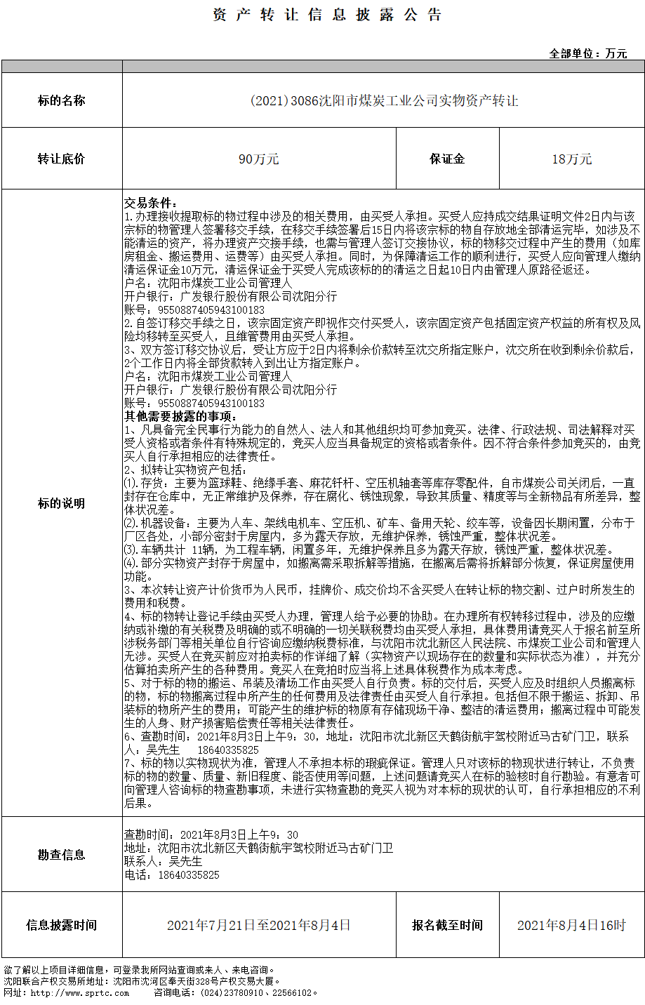 沈陽市煤炭工業(yè)公司實物資產(chǎn)轉(zhuǎn)讓