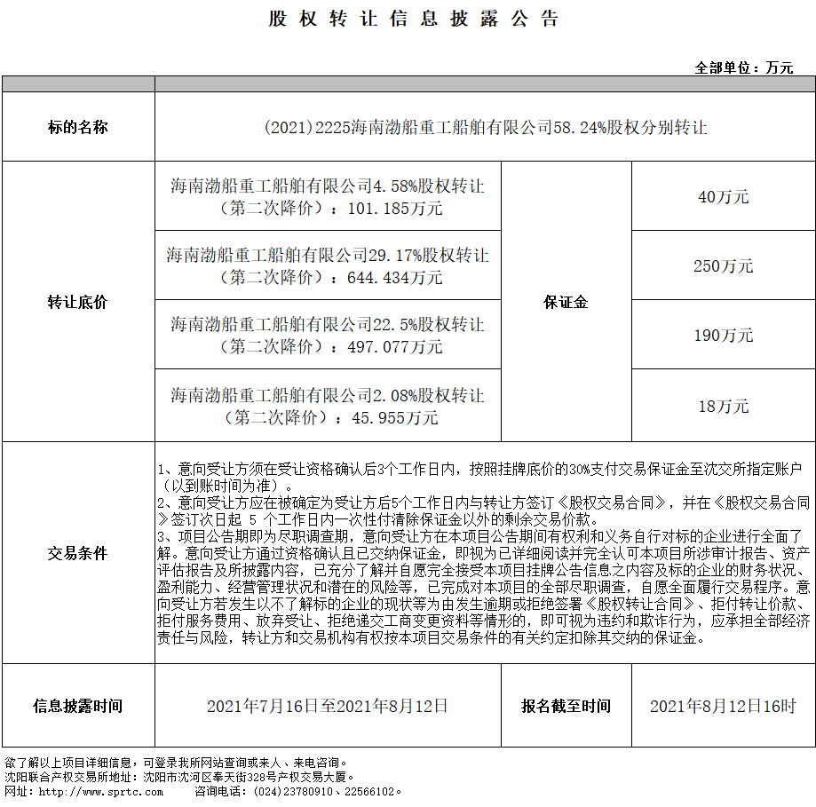 海南渤船重工船舶有限公司2.08%股權(quán)轉(zhuǎn)讓(第二次降價)