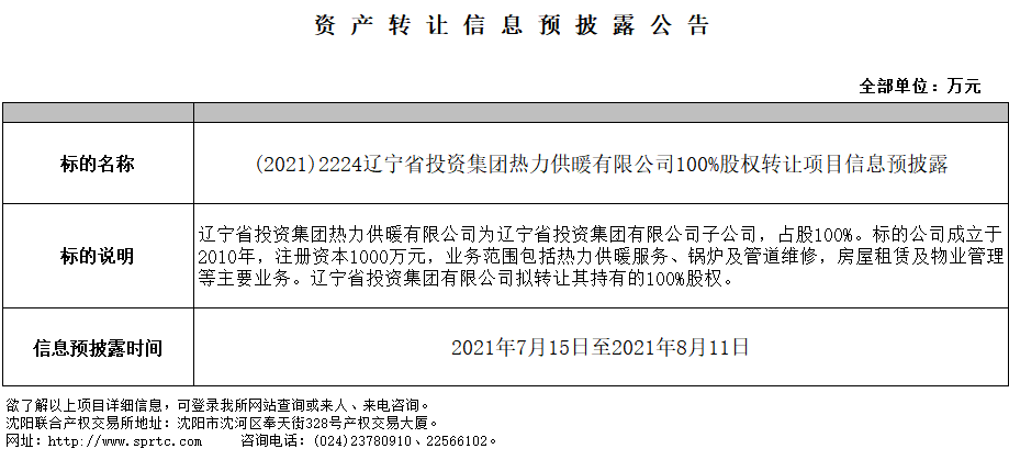 遼寧省投資集團(tuán)熱力供暖有限公司100%股權(quán)轉(zhuǎn)讓信息預(yù)披露