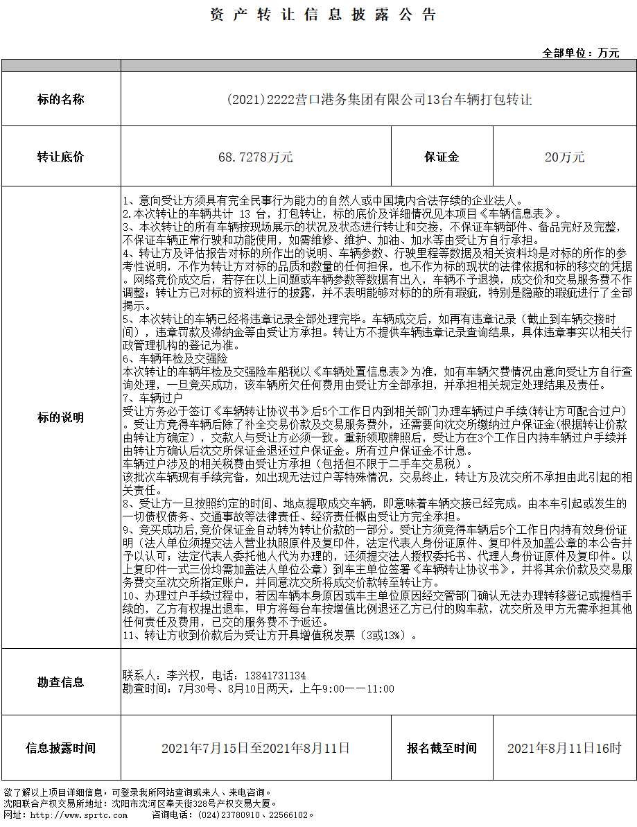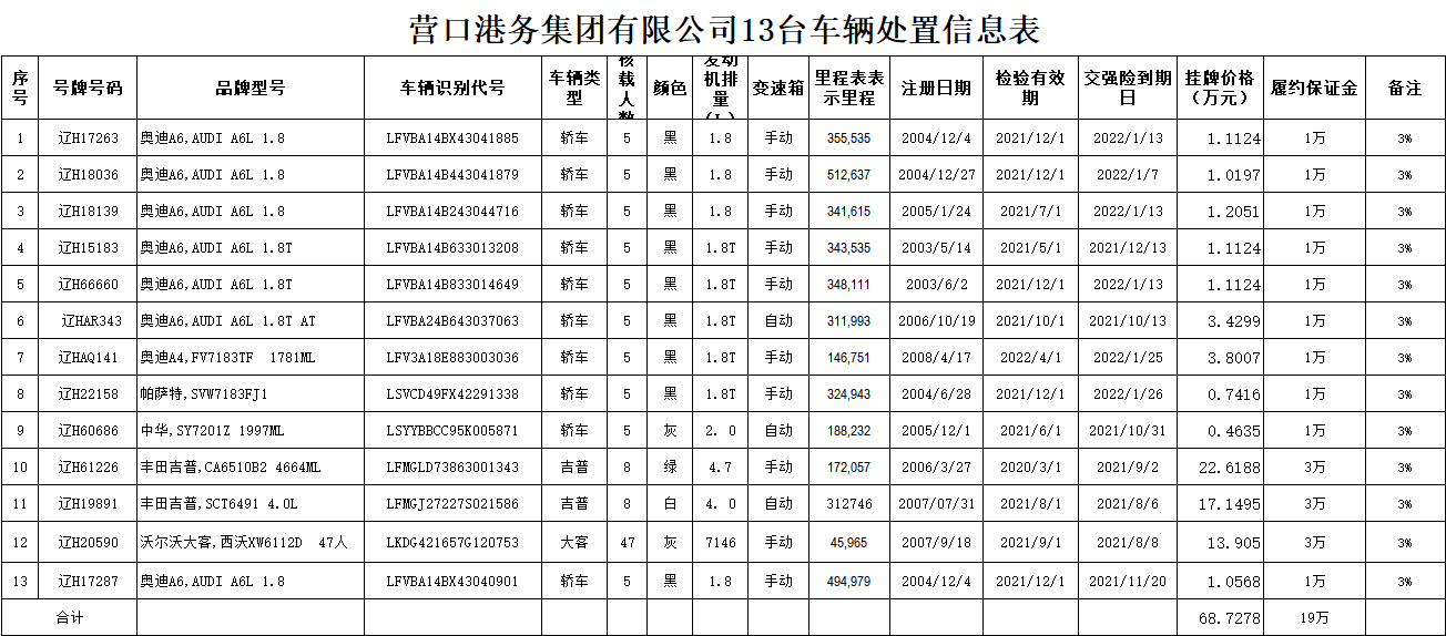 營口港務(wù)集團(tuán)有限公司13臺車輛打包轉(zhuǎn)讓