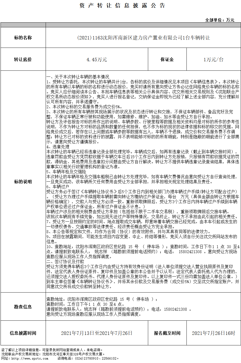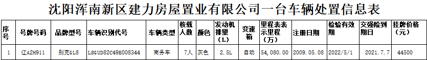 沈陽(yáng)渾南新區(qū)建力房產(chǎn)置業(yè)有限公司1臺(tái)車輛轉(zhuǎn)讓