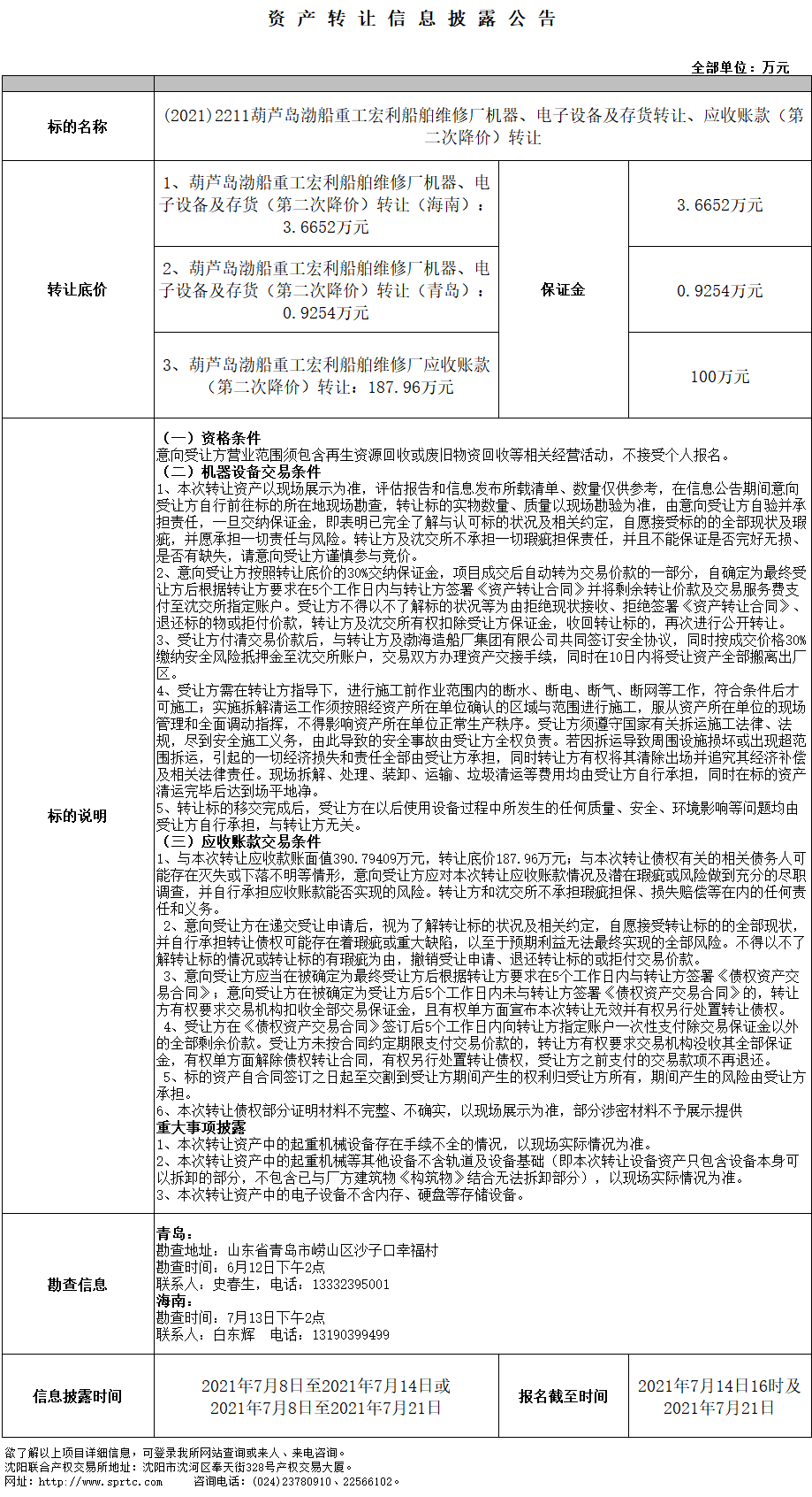 葫蘆島渤船重工宏利船舶維修廠應收賬款(第二次降價)轉(zhuǎn)讓