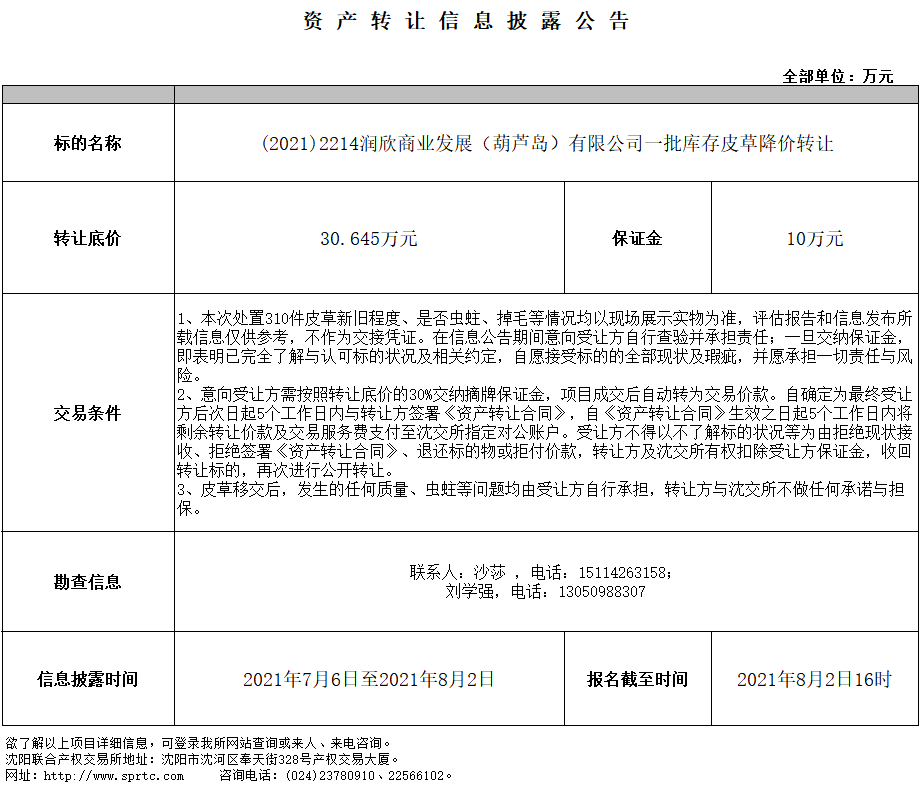 潤欣商業(yè)發(fā)展(葫蘆島)有限公司一批庫存皮草降價轉(zhuǎn)讓