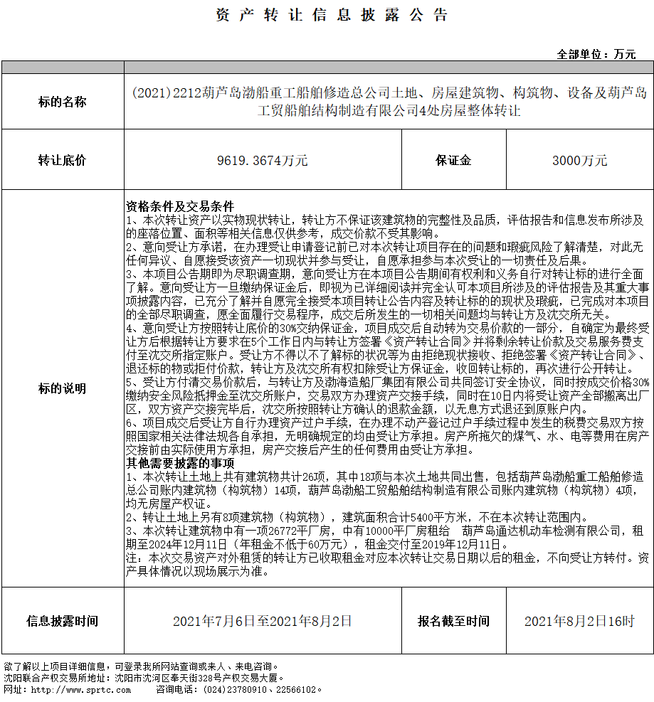 葫蘆島渤船重工船舶修造總公司土地、房屋建筑物、構(gòu)筑物、設(shè)備及葫蘆島工貿(mào)船舶結(jié)構(gòu)制造有限公司4處房屋整體轉(zhuǎn)讓(第一次降價)