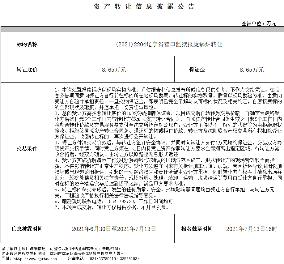 遼寧省營(yíng)口監(jiān)獄報(bào)廢鍋爐轉(zhuǎn)讓