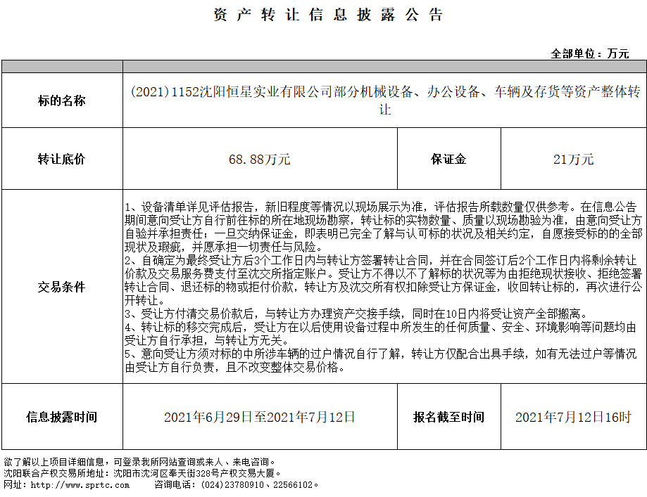 沈陽恒星實業(yè)有限公司部分機械設備、辦公設備、車輛及存貨等資產(chǎn)整體轉(zhuǎn)讓