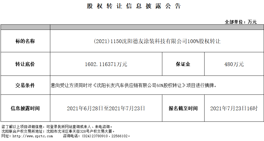 沈陽德友涂裝科技有限公司100%股權(quán)轉(zhuǎn)讓