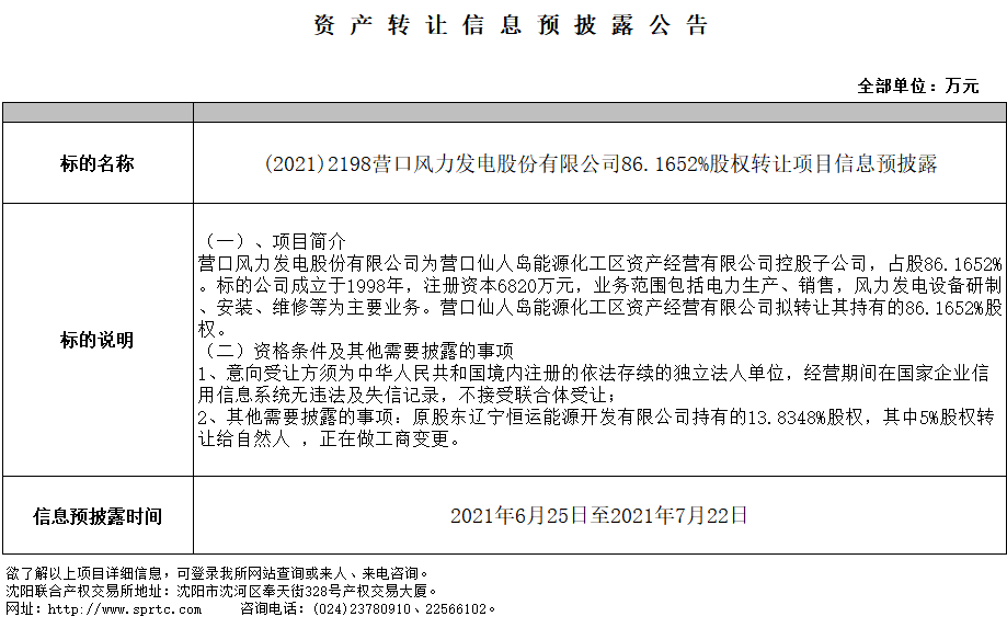 營口風(fēng)力發(fā)電股份有限公司86.1652%股權(quán)轉(zhuǎn)讓