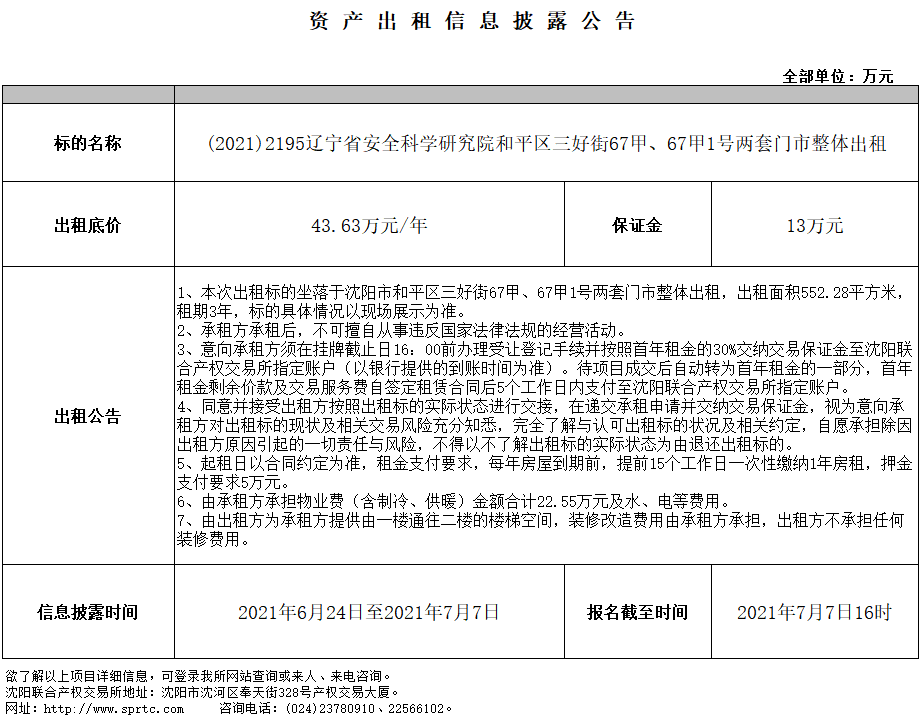 遼寧省安全科學(xué)研究院和平區(qū)三好街67甲、67甲1號(hào)兩套門市整體出租