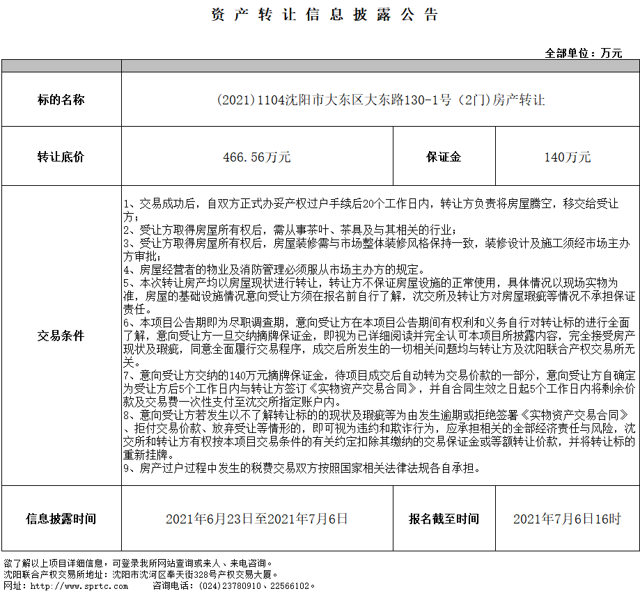沈陽市大東區(qū)大東路130-1號(2門)房產(chǎn)轉(zhuǎn)讓