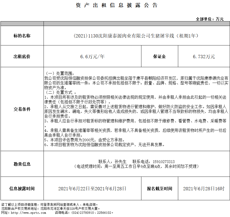 沈陽康泰源肉業(yè)有限公司生豬屠宰線(租期1年)
