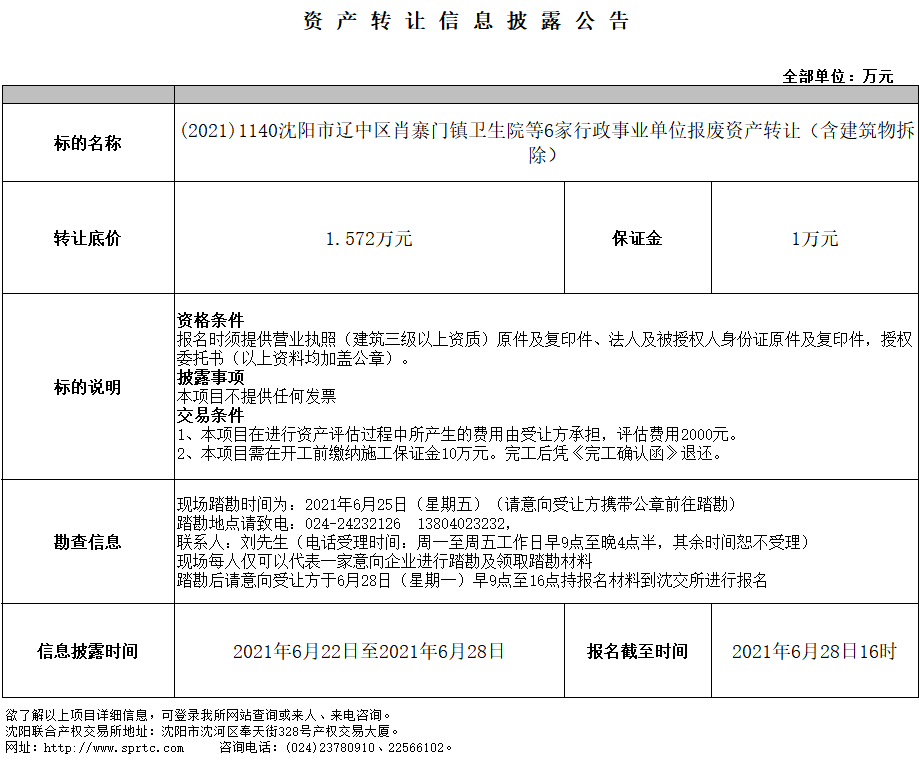 沈陽市遼中區(qū)肖寨門鎮(zhèn)衛(wèi)生院等6家行政事業(yè)單位報廢資產轉讓(含建筑物拆除)