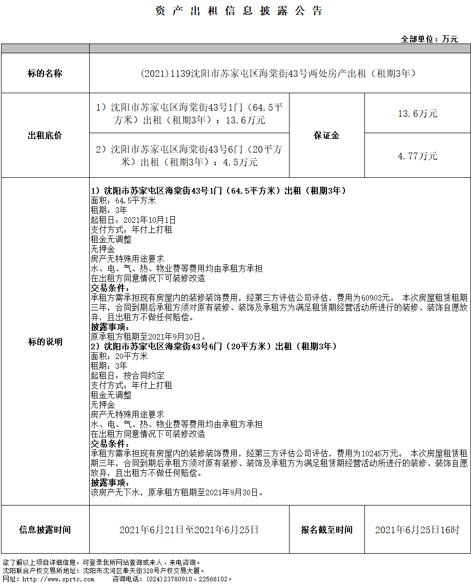 沈陽(yáng)市蘇家屯區(qū)海棠街43號(hào)1門(64.5平方米)出租(租期3年)