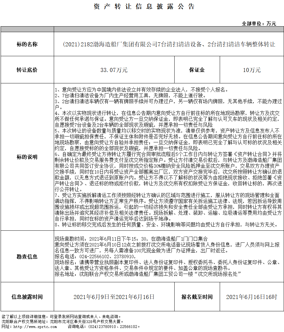 渤海造船廠集團(tuán)有限公司7臺(tái)清掃清潔設(shè)備、2臺(tái)清掃清潔車輛整體轉(zhuǎn)讓