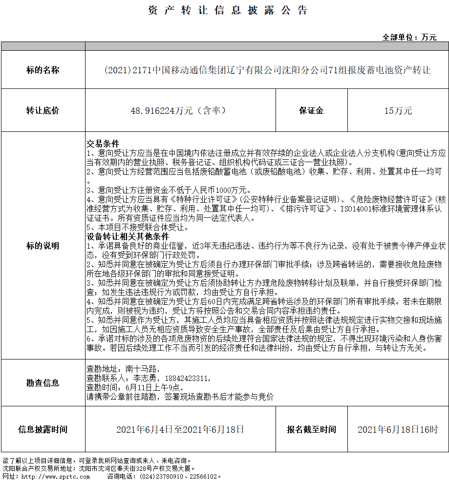 中國移動通信集團遼寧有限公司沈陽分公司71 組報廢蓄電池資產(chǎn)轉(zhuǎn)讓