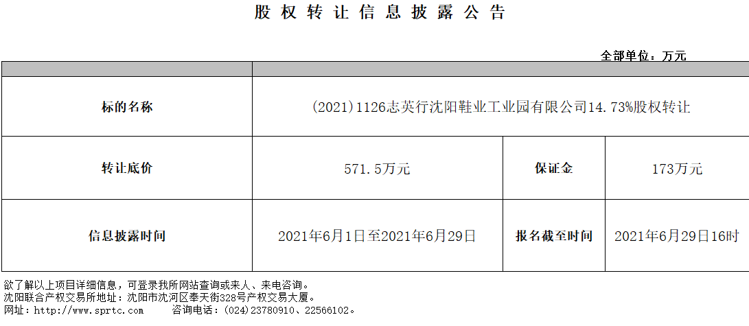 項目鏈接:志英行沈陽鞋業(yè)工業(yè)園有限公司14.73%股權(quán)轉(zhuǎn)讓