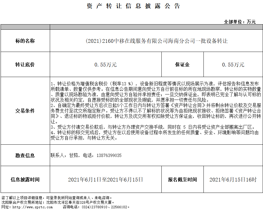 中移在線服務有限公司海南分公司一批設備轉(zhuǎn)讓