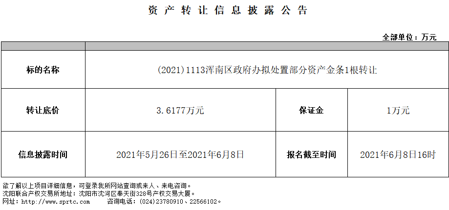 渾南區(qū)政府辦擬處置部分資產(chǎn)金條1根轉(zhuǎn)讓