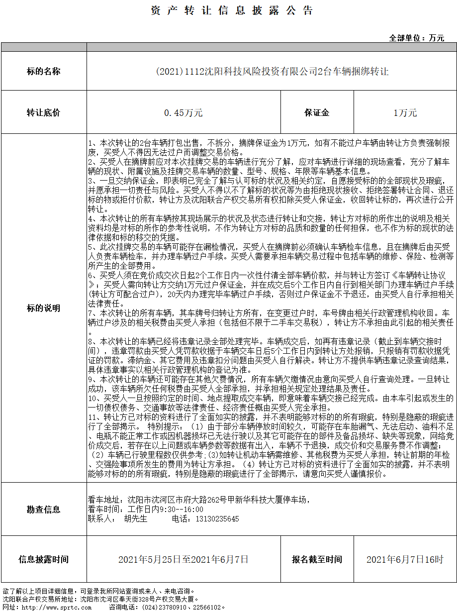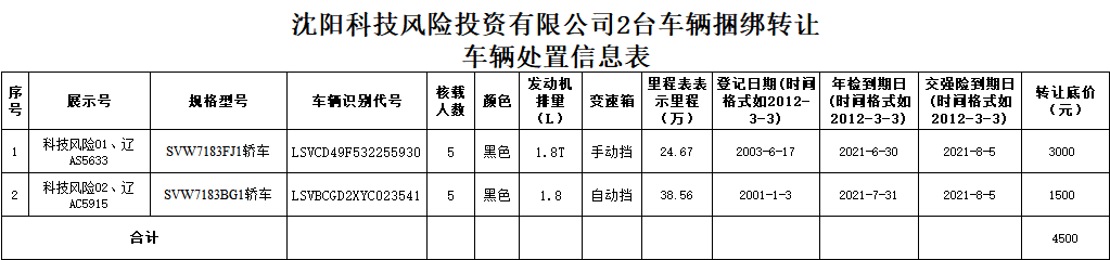 沈陽科技風(fēng)險投資有限公司2臺車輛捆綁轉(zhuǎn)讓