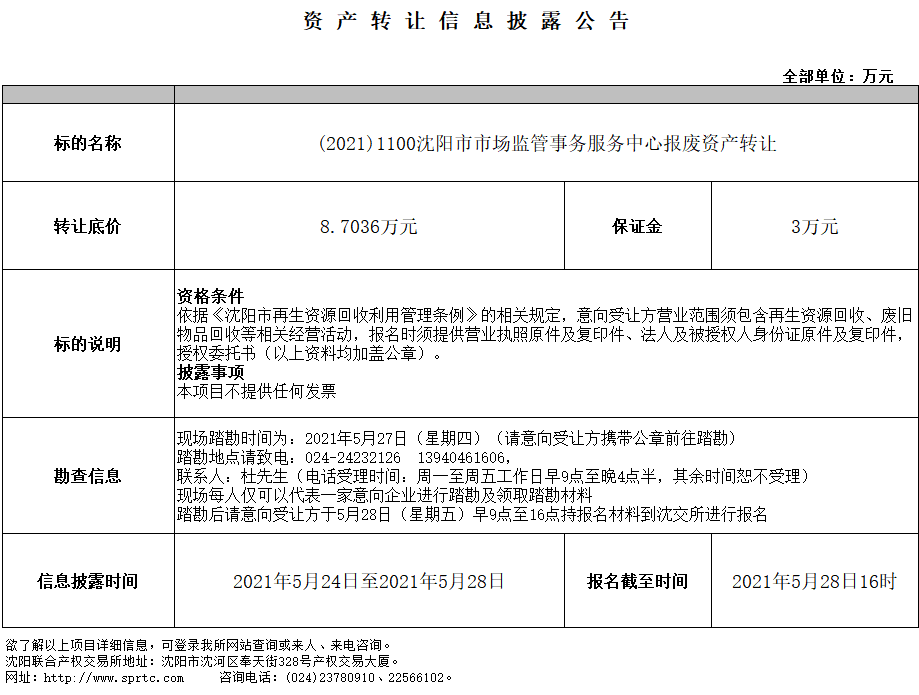 沈陽市市場(chǎng)監(jiān)管事務(wù)服務(wù)中心報(bào)廢資產(chǎn)