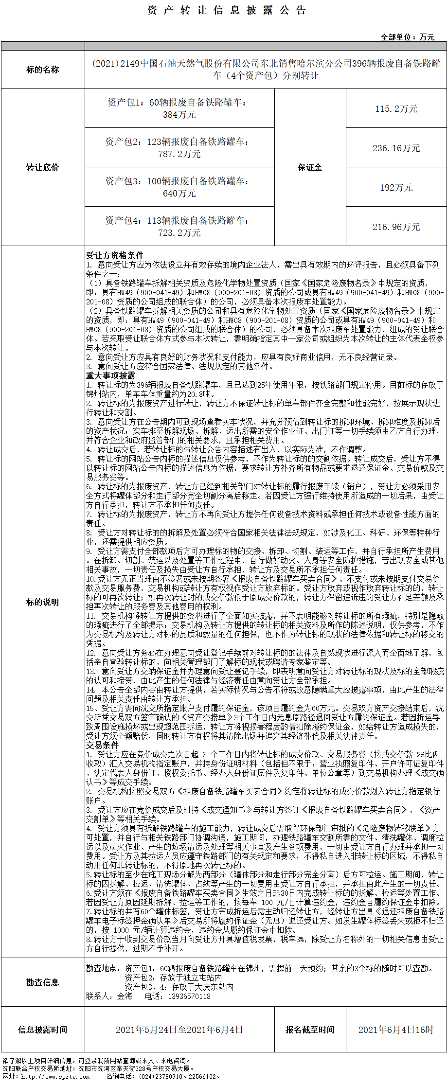 中國石油天然氣股份有限公司東北銷售哈爾濱分公司60輛報廢自備鐵路罐車轉(zhuǎn)讓