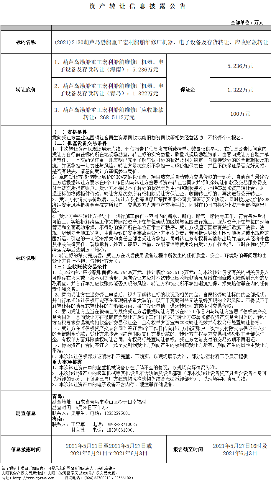 葫蘆島渤船重工宏利船舶維修廠機器、電子設(shè)備及存貨轉(zhuǎn)讓(海南)