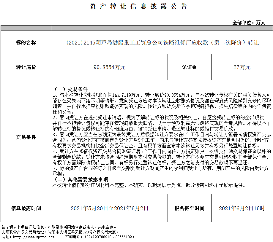 葫蘆島渤船重工工貿(mào)總公司鐵路維修廠應收款(第二次降價)轉讓