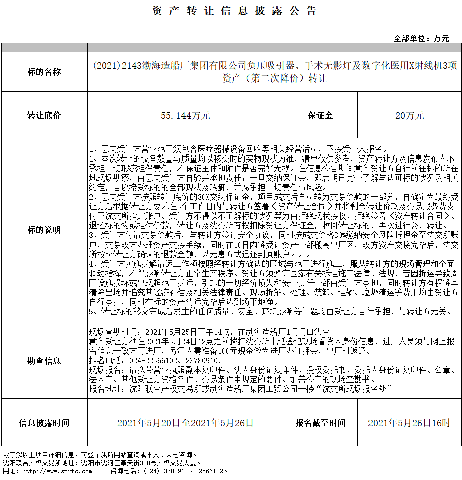 渤海造船廠集團有限公司負壓吸引器、手術無影燈及數(shù)字化醫(yī)用X射線機3項資產(chǎn)(第二次降價)轉(zhuǎn)讓