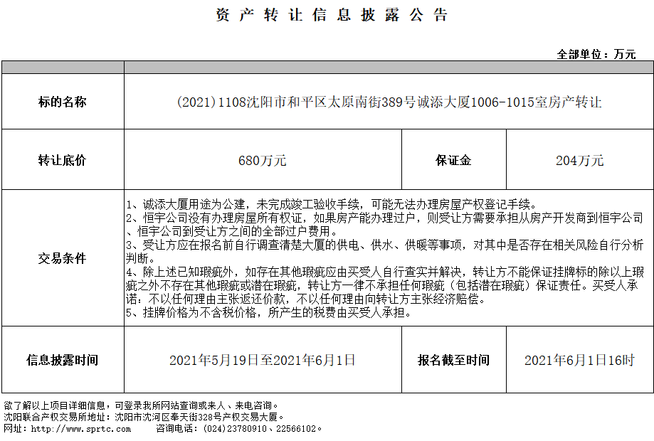 沈陽市和平區(qū)太原南街389號誠添大廈1006-1015室房產(chǎn) 轉(zhuǎn)讓