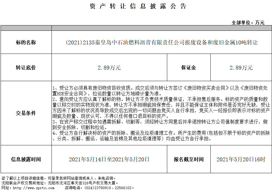 秦皇島中石油燃料瀝青有限責(zé)任公司報廢設(shè)備和廢舊金屬10噸轉(zhuǎn)讓