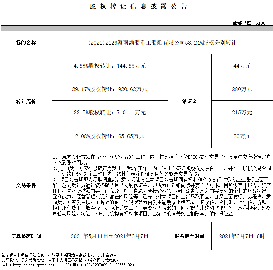 海南渤船重工船舶有限公司2.08%股權(quán) 轉(zhuǎn)讓