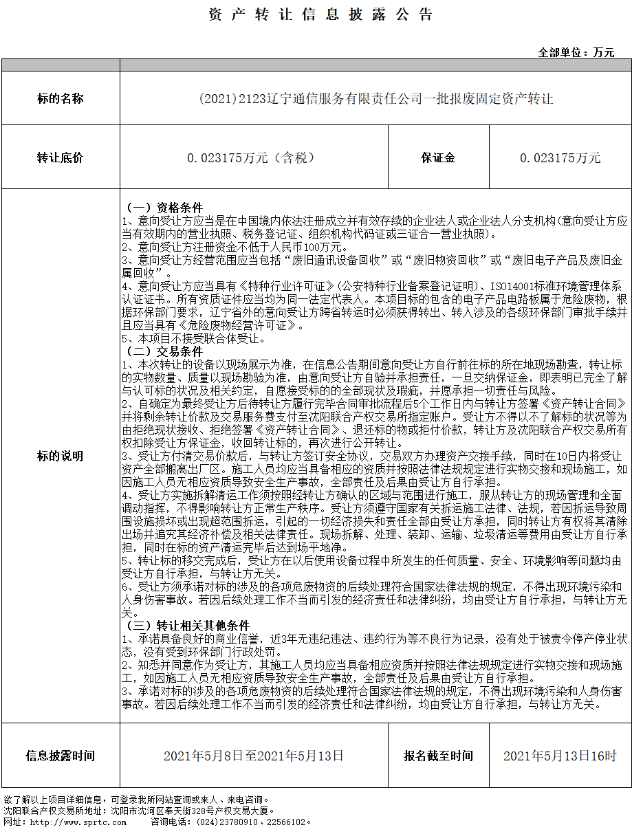 遼寧通信服務(wù)有限責(zé)任公司一批報廢固定資產(chǎn)轉(zhuǎn)讓
