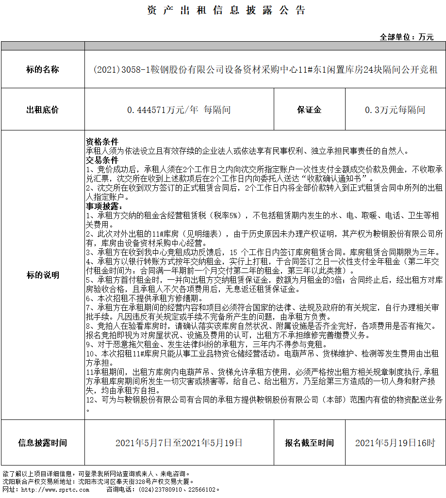 鞍鋼股份有限公司設(shè)備資材采購(gòu)中心11號(hào)庫(kù)東1-19號(hào)出租