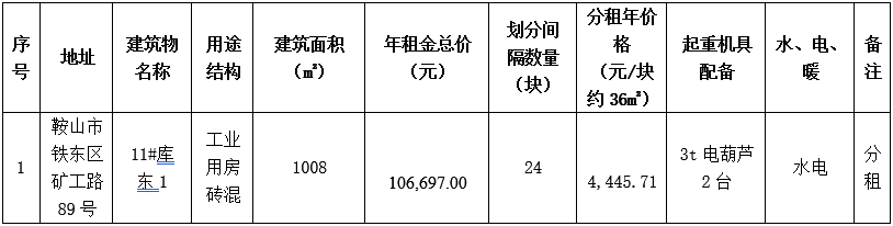 鞍鋼股份有限公司設(shè)備資材采購(gòu)中心11號(hào)庫(kù)東1-24號(hào)出租