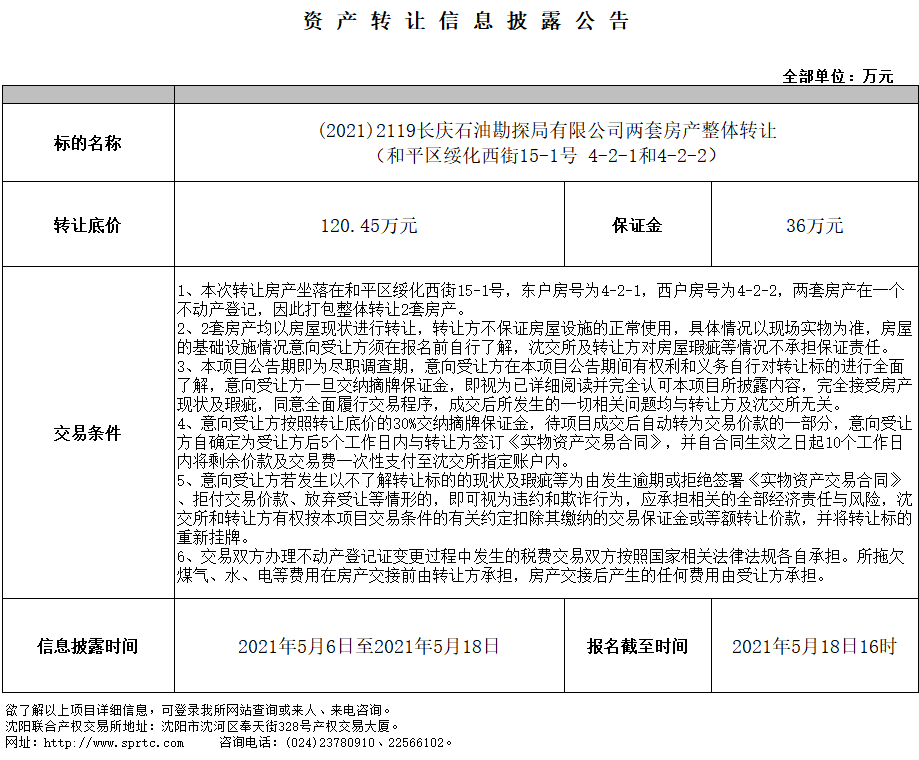 長慶石油勘探局有限公司兩套房產(chǎn)整體轉(zhuǎn)讓(和平區(qū)綏化西街15-1號4-2-1和4-2-2)