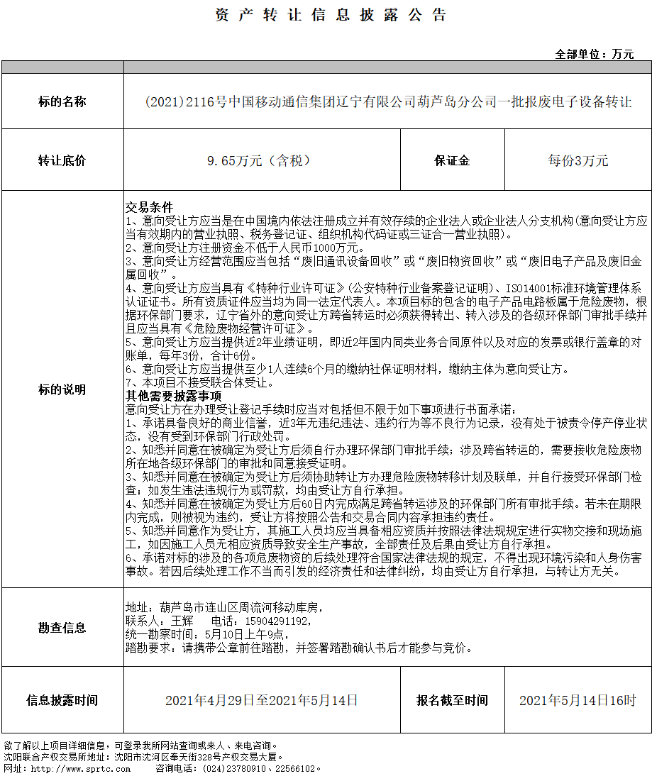 中國(guó)移動(dòng)通信集團(tuán)遼寧有限公司葫蘆島分公司一批報(bào)廢電子設(shè)備轉(zhuǎn)讓